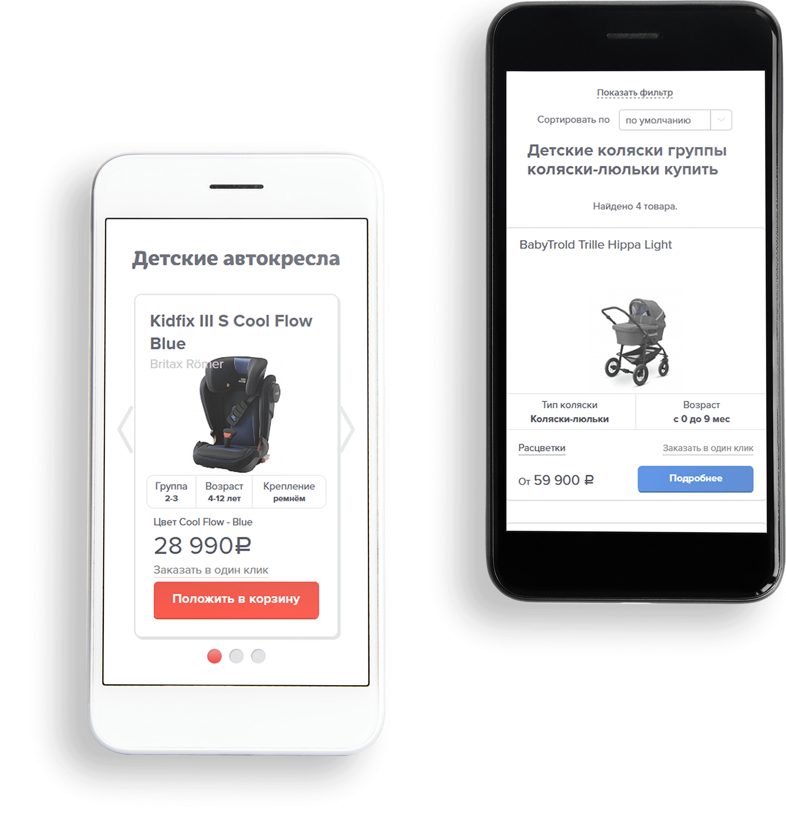 Два основных товарных раздела сайта — «Детские автокресла» и «Коляски» — выполнены для удобства в разных цветовых решениях.