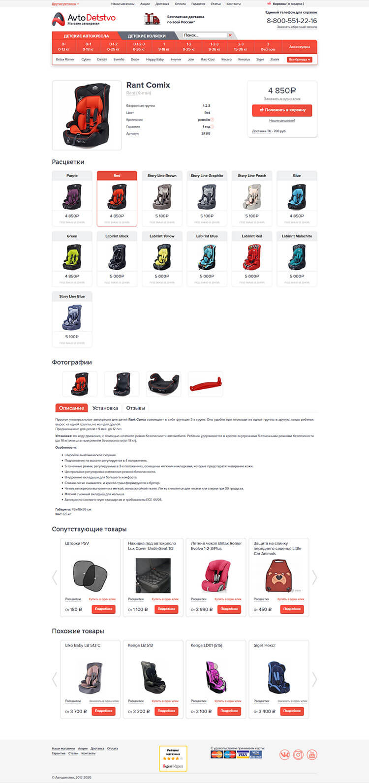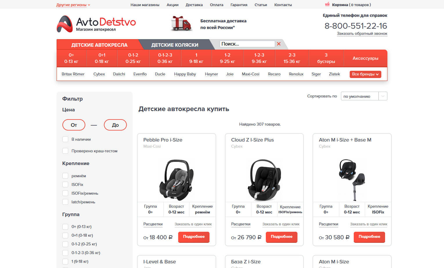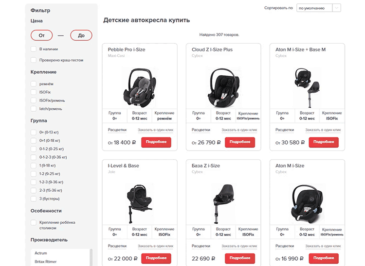 Особенностью магазина является наличие различных фильтров: по цене, производителю, проводившимся краш-тестам, наличию на складе в разных городах, возрасту и весу ребёнка и т.д. Благодаря этому пользователь может найти подходящую модель по целому ряду критериев, сравнить их и принять решение о покупке.