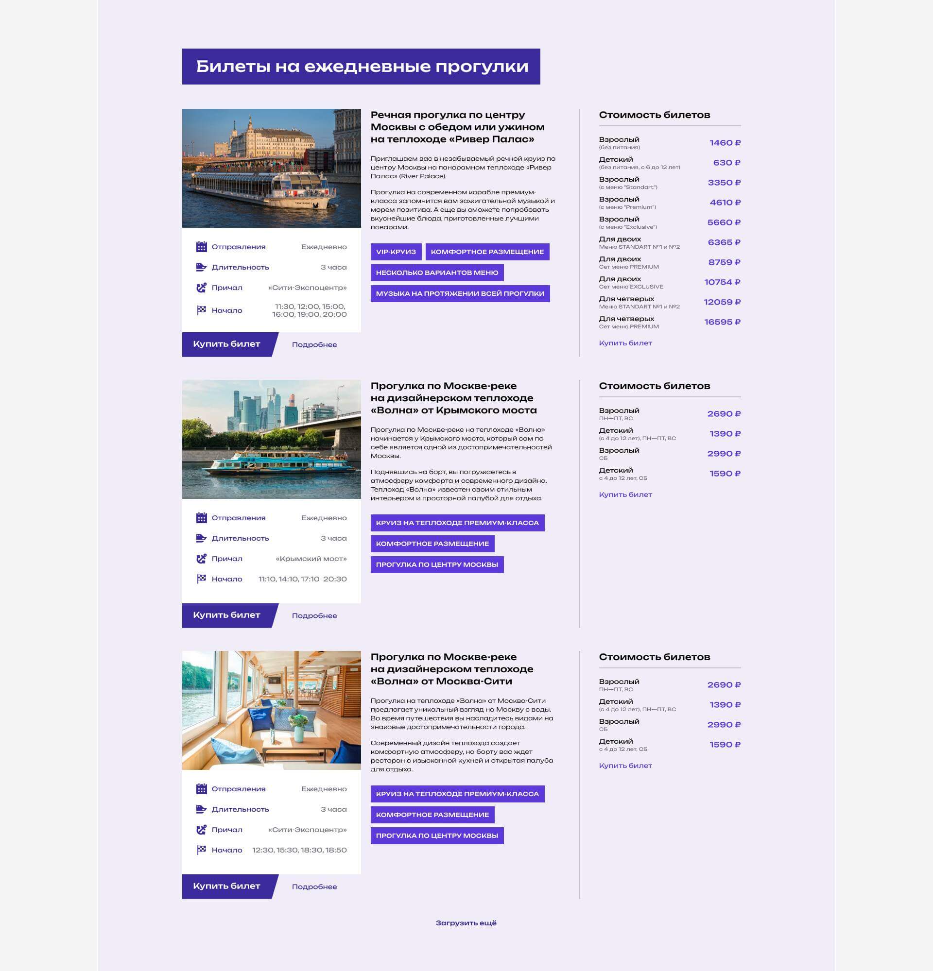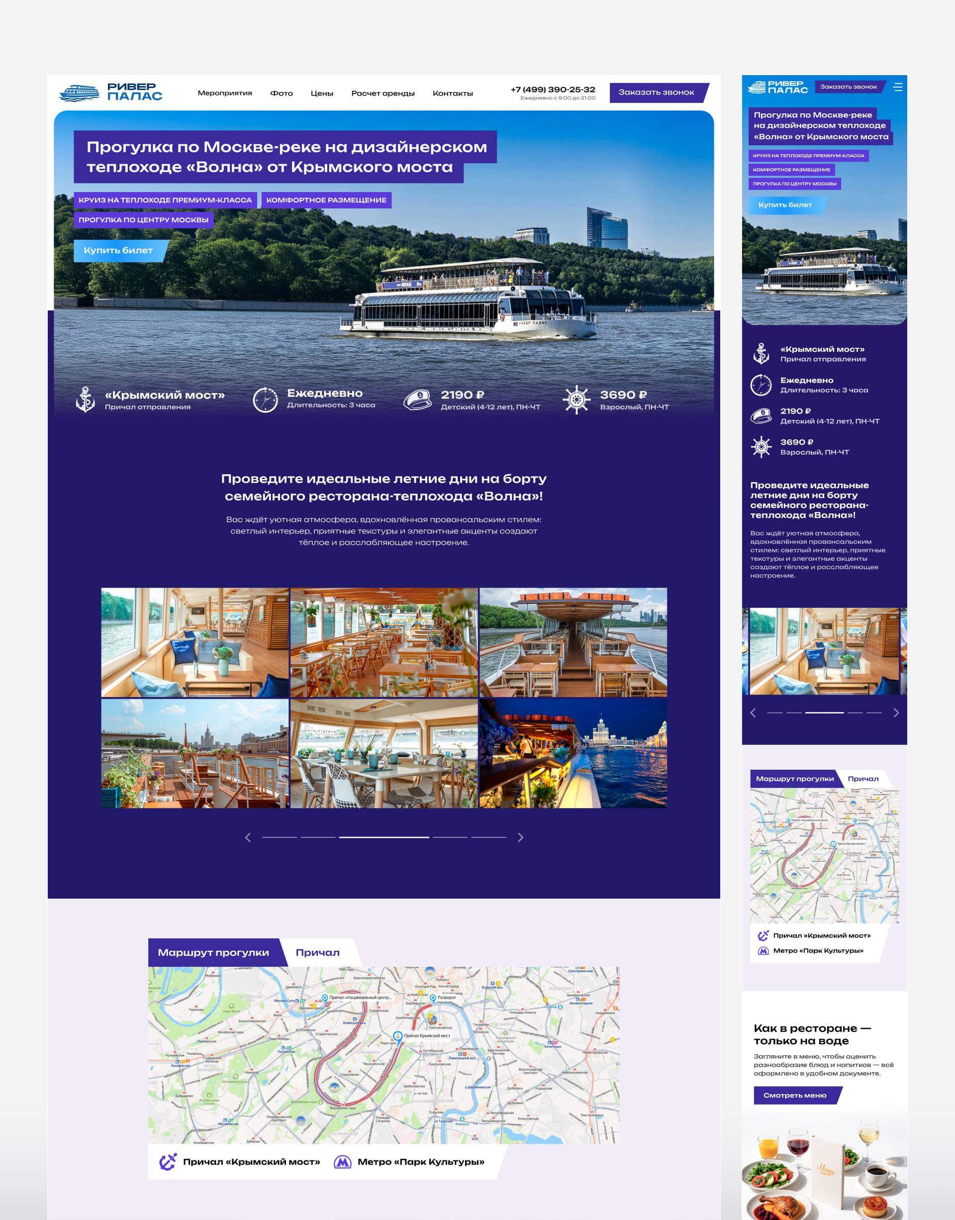 В процессе работы над сайтом был фактически сформирован новый фирменный стиль суб-бренда Теплоход «Ривер Палас». Разработанная при создании сайта стилистика получилась легко адаптируемой под любые носители.