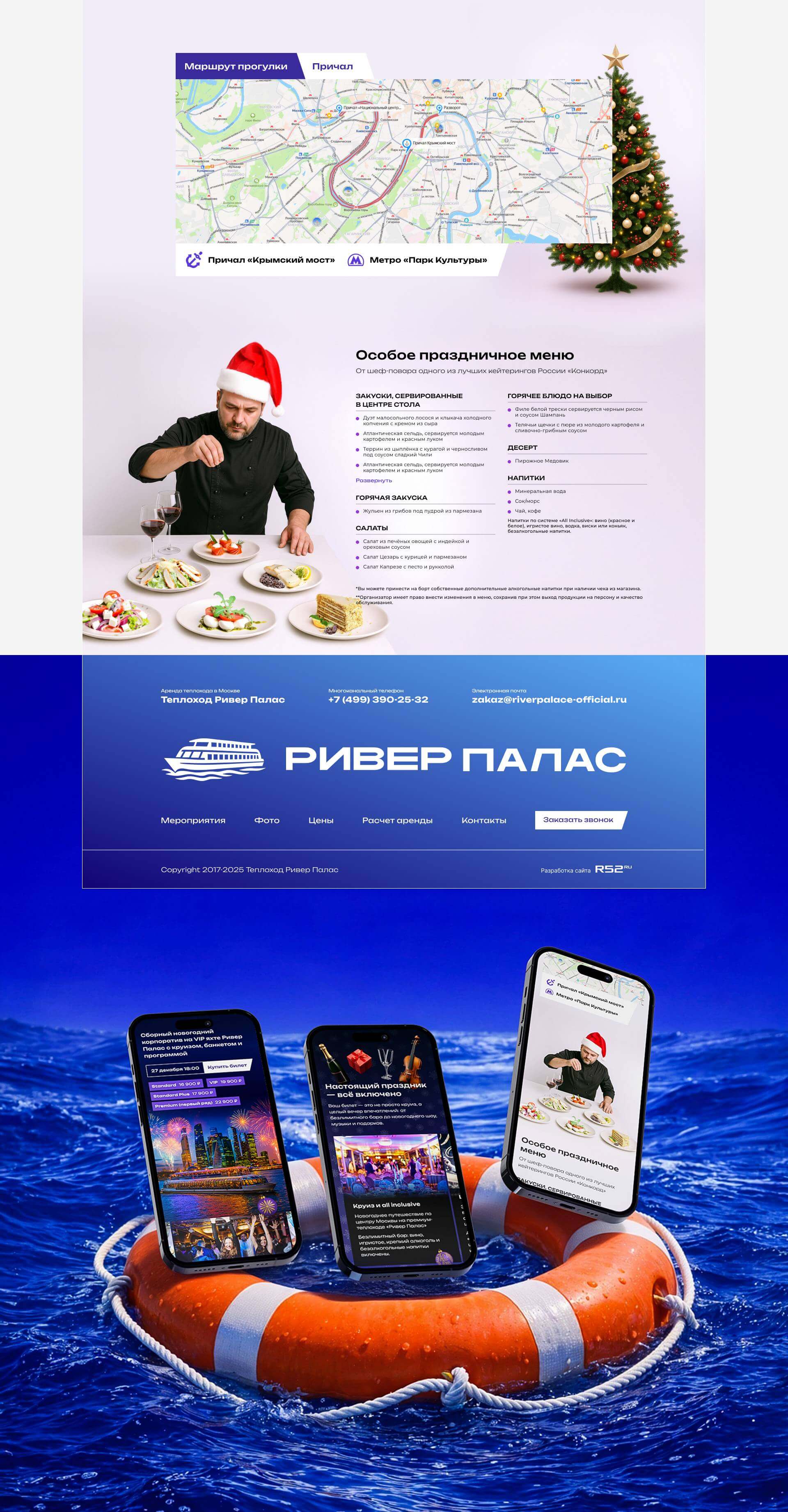 Необходимо было создать яркий промо-ресурс, продвигающий прогулки и мероприятия на этом люксовом теплоходе в зимний сезон и период новогодних корпоративов, сохранив при этом привлекательность для зрелой и платёжеспособной аудитории.